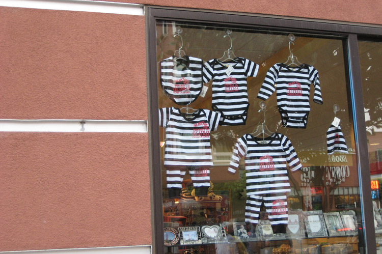 恶魔岛监狱的相关纪念品之一“婴儿囚衣”,上书“Rejected; Too cute!”